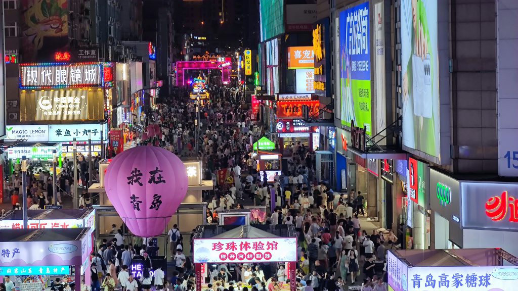 五四的夜是充满着流动性的,流光溢彩映在每个过往者的脸上,酒香混着烤肉的炙香挑动着味蕾,摇滚音乐的鼓点每一拍都带动着心脏剧烈摇晃,年轻的气息在这里每一处洋溢。行走在夜晚的五四广场,就像置身于一场月夜下的狂欢派对。